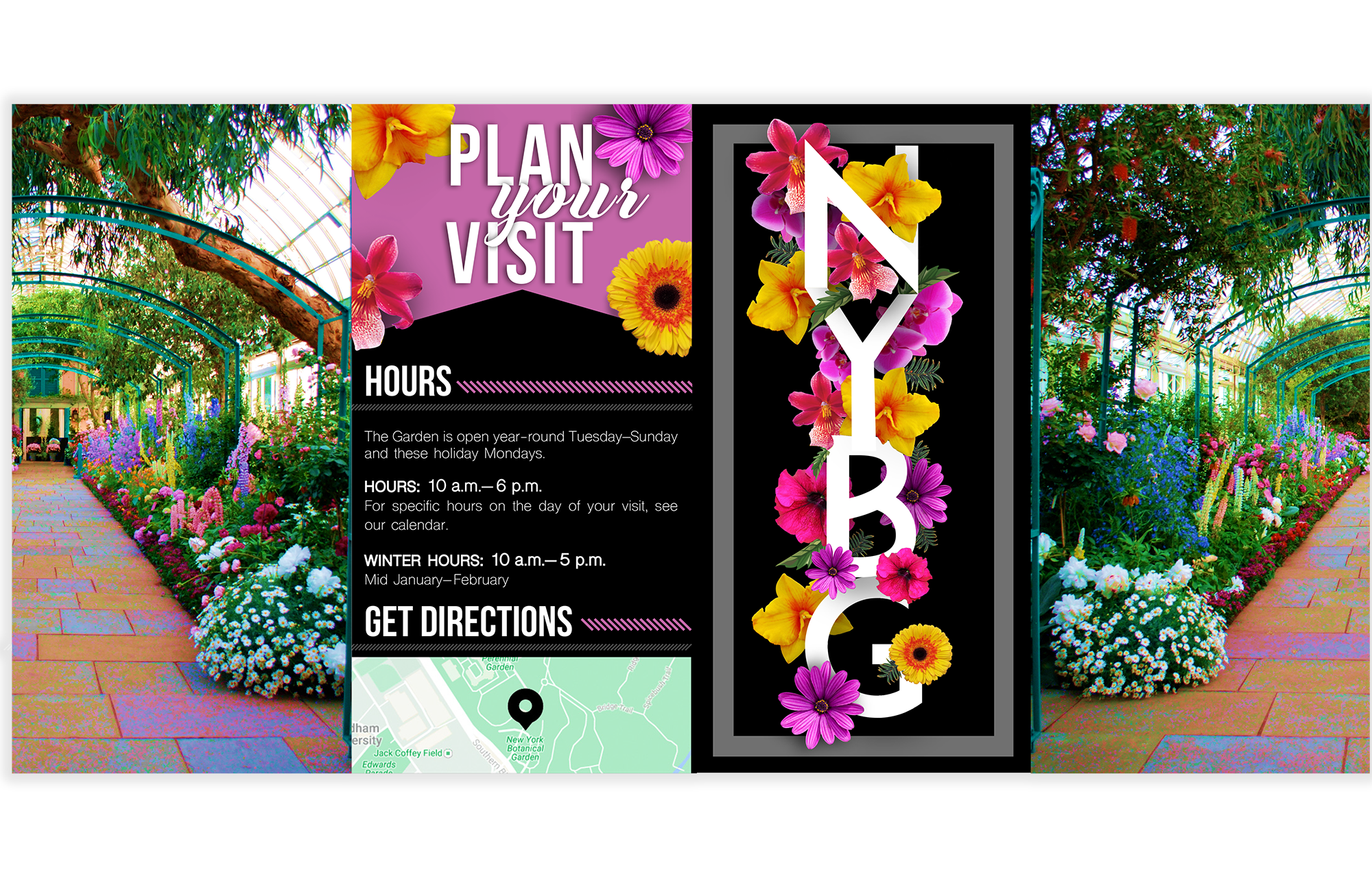 For this project, I designed a brochure for the New York Botanical Garden. I really enojoyed researching all the beautiful images of flowers and gardens for this project. I wanted to include as many images of the beautiful imagery that is involved in the botanical garden. This project was created in InDesign and Illustrator.