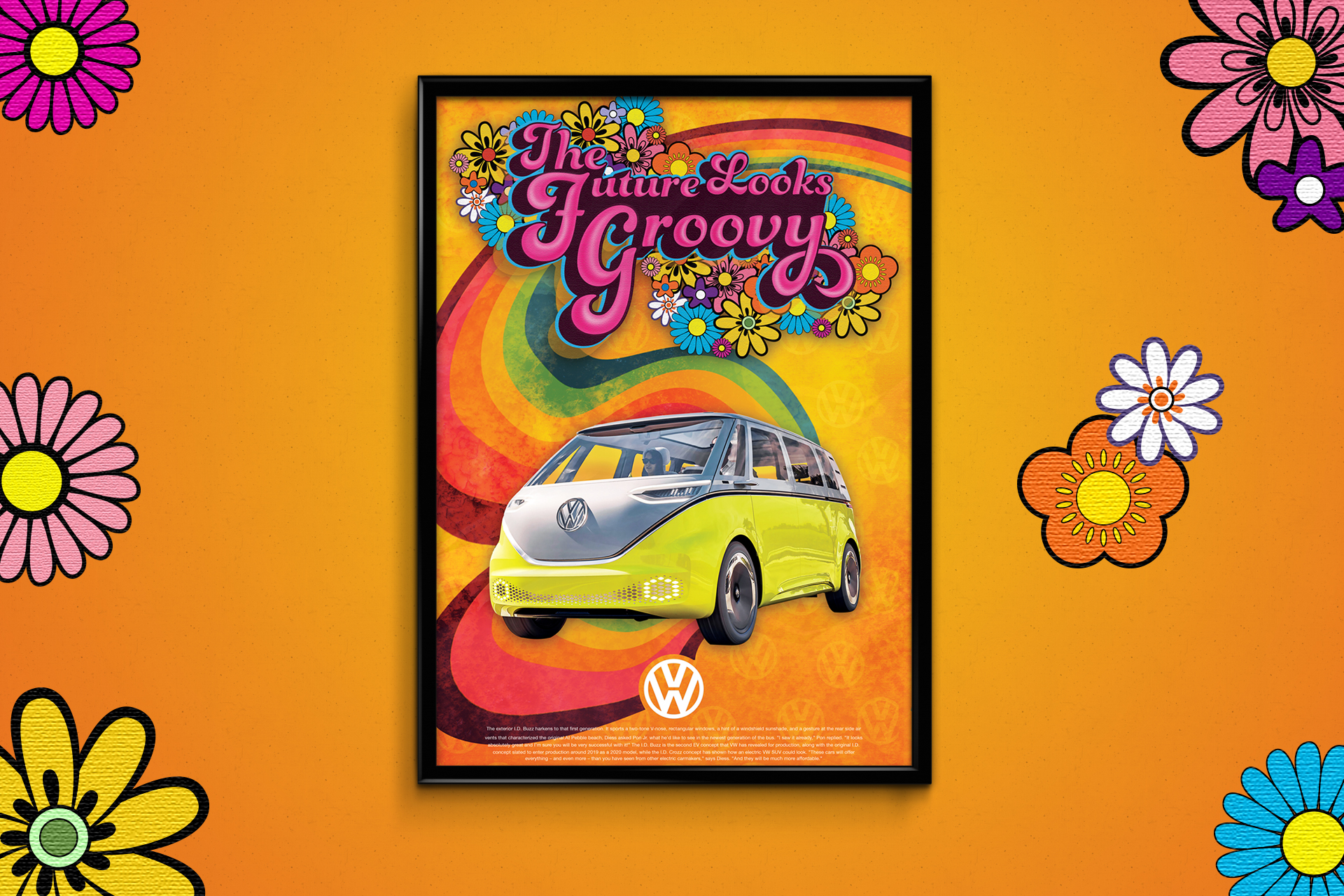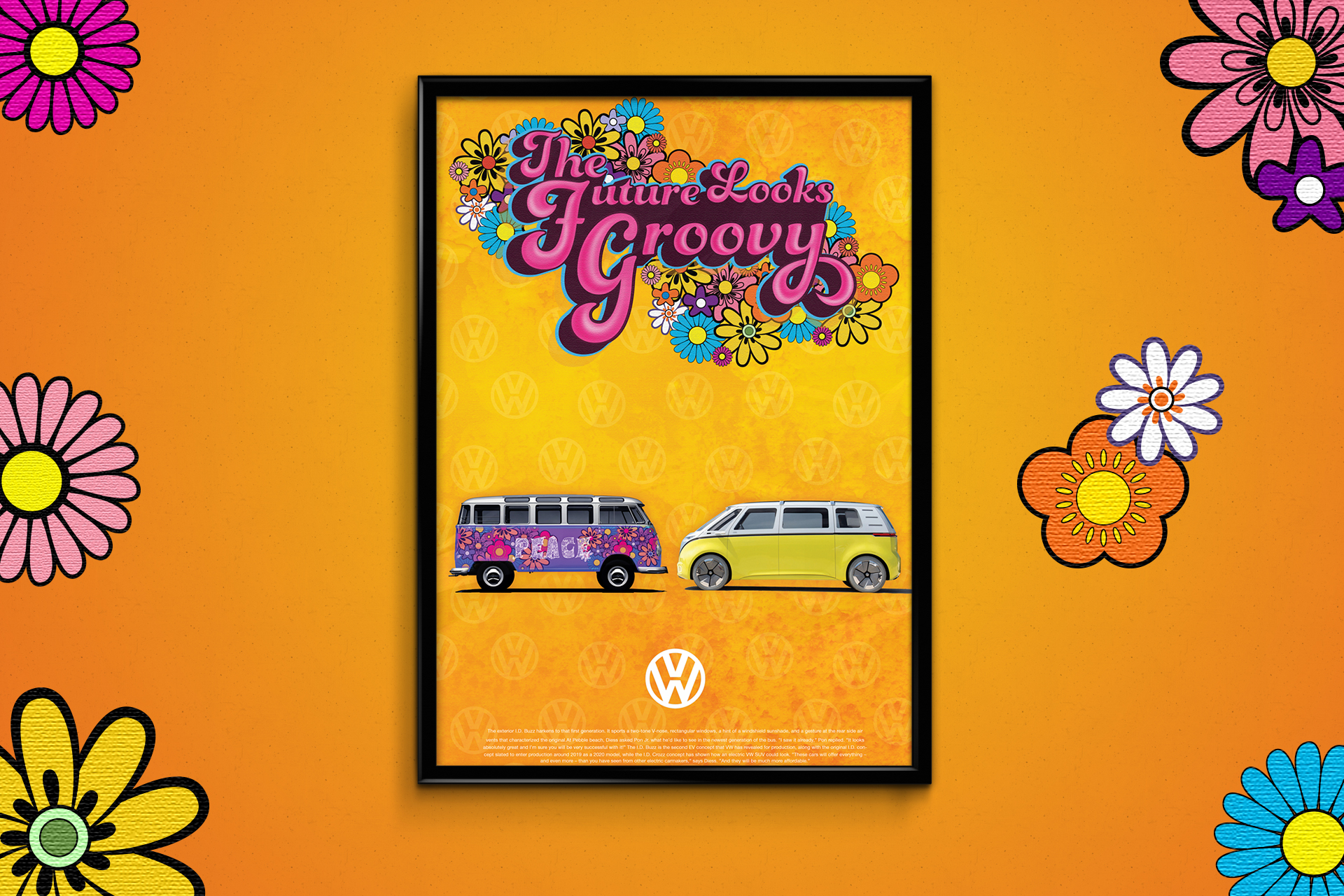 These are three posters that I designed for an advertising class. I chose to create a campaign based on the installment of the new, modern Volkswagen Bus. I included a psychodelic flower power pattern so that this would appeal not only the audience of “hippie” era but also pertain to a modern audience as well. I created this project in Illustrator and Photoshop